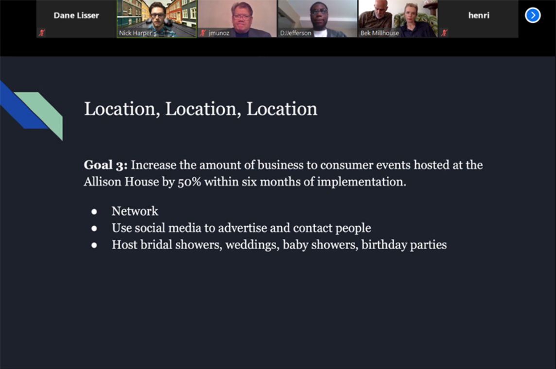 Dr. Munoz decided to make it a class competition and have the students compete to create the best strategic plan. "I divided the class into four teams and each team worked together to create the best set of strategies for the Allison House," Munoz said.