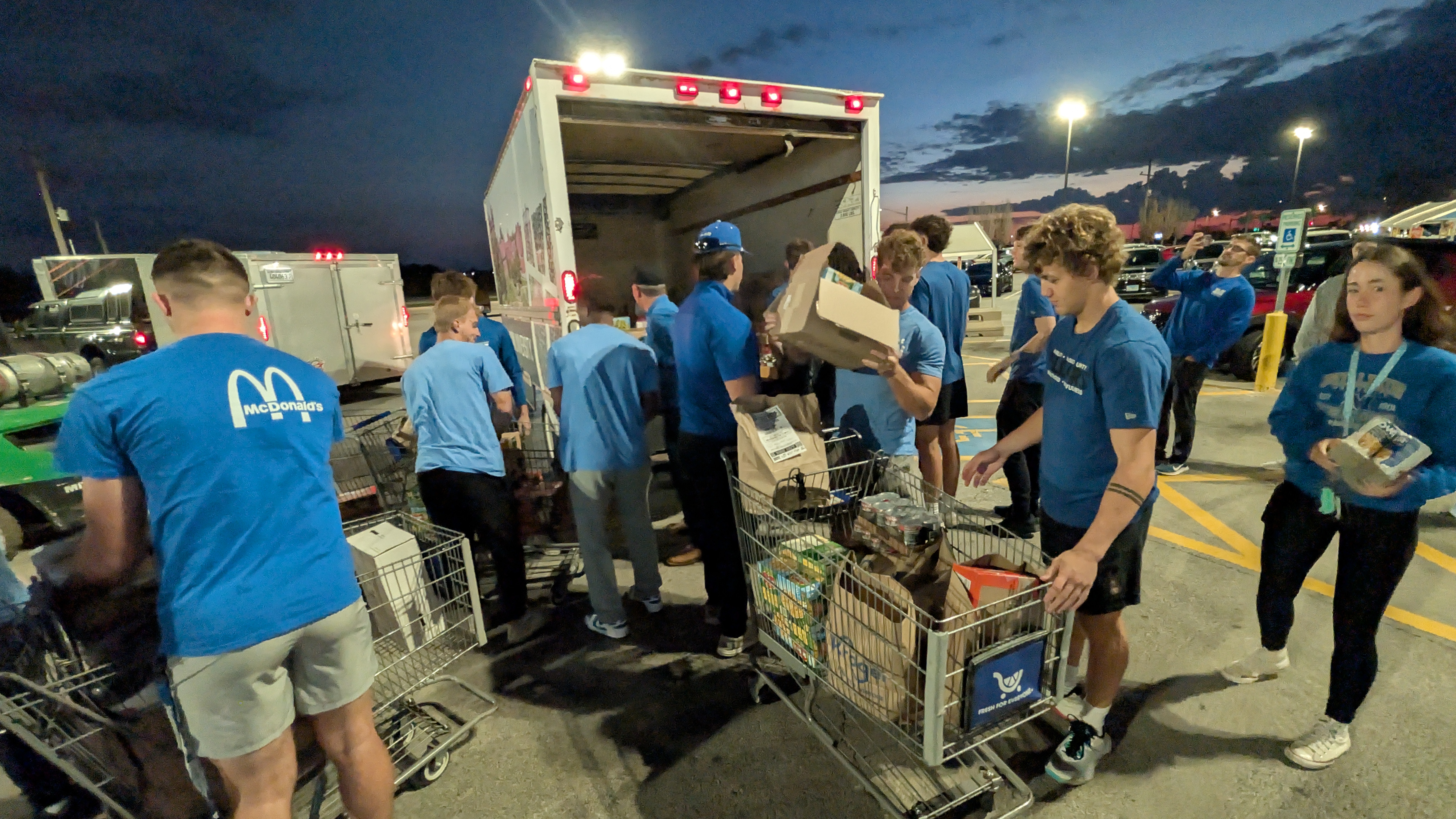 Students, faculty, staff, alumni, and local supporters all played a part in the campaign’s success. Millikin’s donations were formally presented at the food drive’s live broadcast site on Friday morning. A Millikin truck, driven by Vice President of Athletics and Community Engagement Lori Kerans, filled with nearly two tons of donations, was led to the WSOY drop-off location by the Big Blue Cheerleading squad. Student-athletes from several Big Blue teams were on hand to help unload and weigh Millikin’s donation