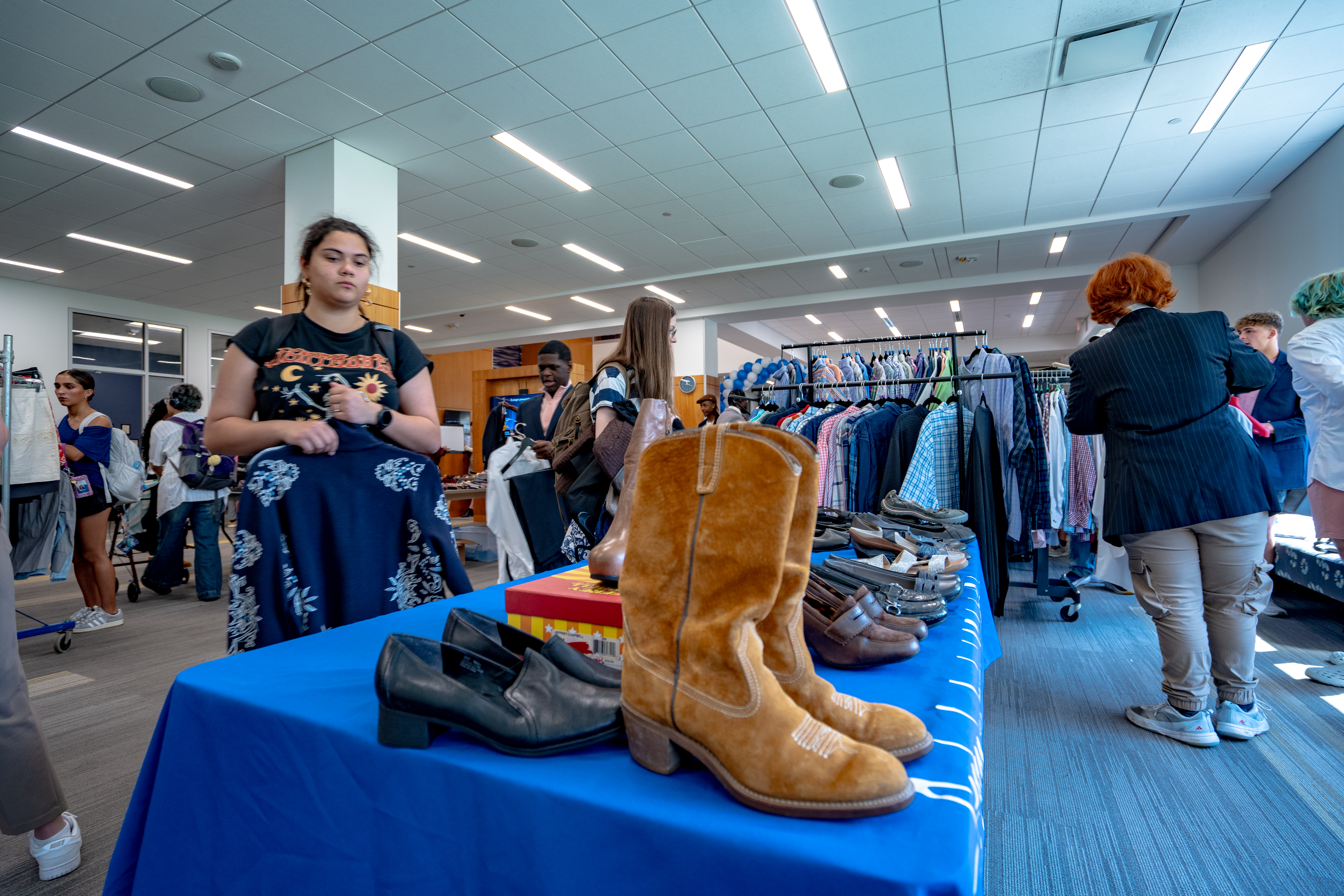 Students can browse a wide selection of free professional clothing – suits, dresses, pants, shirts, blouses, and accessories – to help them look polished and feel confident for the upcoming Spring 2026 Career Fair, held on March 5, 2026, or for an upcoming internship or job interview.
