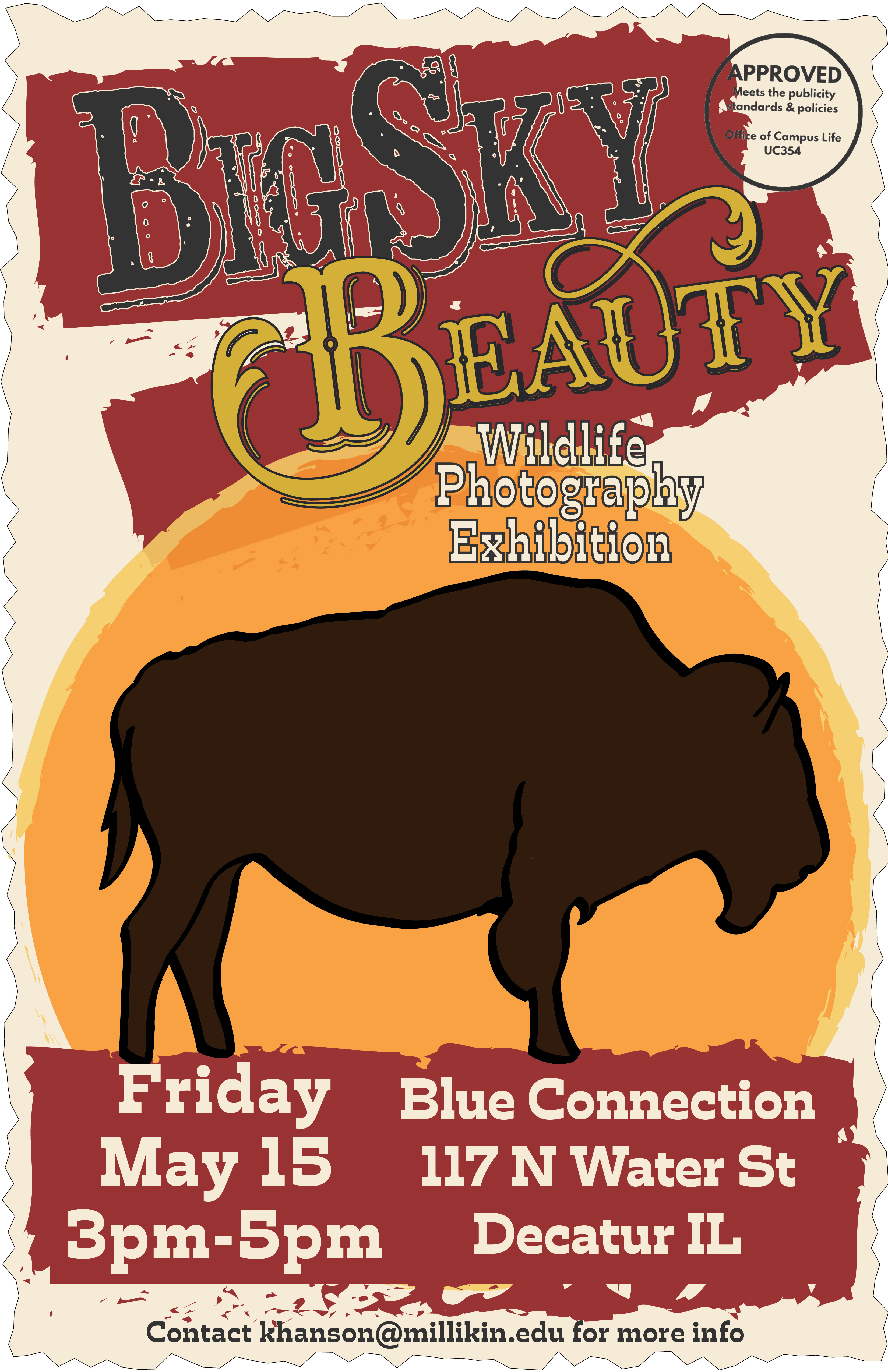 Big Sky Beauty: Wildlife Photography Exhibition - Senior Capstone by Kayla Hanson May 15 Friday, May 15, 2026 - 3 to 5pm Blue Connection and BC Studios Open to the public Share: Upcoming Events Spring SingApril 26, 2026 Millikin's Images in Motion Film FestivalMon, Apr 27 2026, 6 - 8pm P&T Informational WorkshopTue, Apr 28 2026, 4 - 5pm